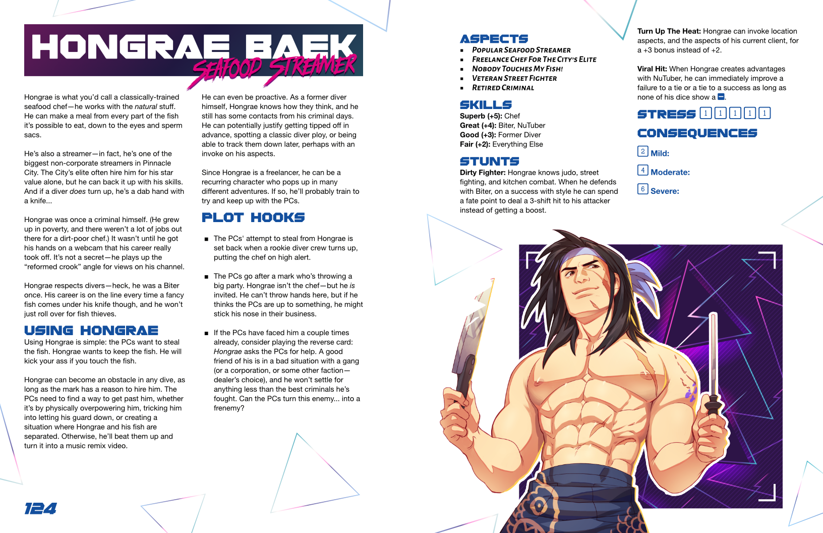 WETRUNNER is a cyberpunk fishing TTRPG set in a post-climate-collapse world where the rich hoard fish. You play divers, the elite criminals of 2150, who stage elaborate heists to steal these fish and maybe change the world for the better. This 230-page PDF includes: